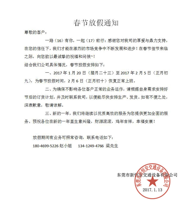 - 2017年新恒安交通設(shè)備春節(jié)放假通知