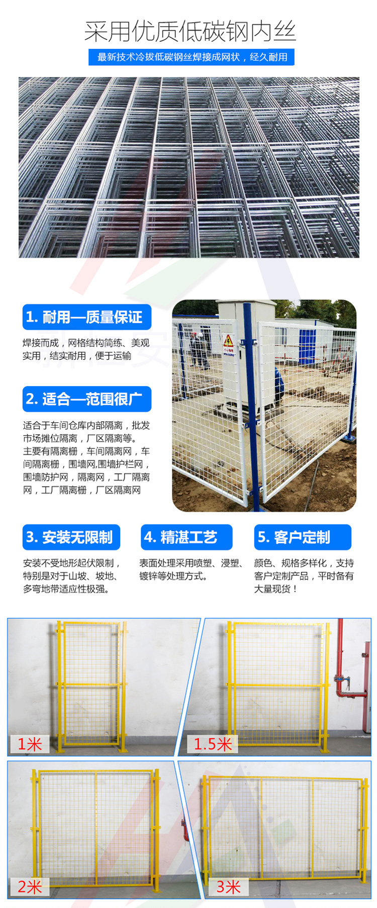 - 新款東莞基坑防護(hù)欄桿廠家定做批發(fā) 安全護(hù)欄網(wǎng)是建筑施工現(xiàn)場(chǎng)預(yù)防人身傷害必備的防護(hù)設(shè)施,它適用于各類(lèi)建筑施工工地的安全防護(hù),醒目的顏色標(biāo)記可以起到提前警示工人危險(xiǎn)的地方應(yīng)該注意安全,是各個(gè)建筑工地不可或缺的建筑用網(wǎng)。 1.焊點(diǎn):焊點(diǎn)360度滿(mǎn)焊,焊接完后打磨焊點(diǎn),平整光滑。 2.采用高溫烤爐烤漆、表面光滑明亮。 3.質(zhì)檢:出廠嚴(yán)格的質(zhì)量檢測(cè),保證產(chǎn)品質(zhì)量。 4.包裝:底部氣泡膜保護(hù)。 無(wú)縫人工焊接 斜口焊縫,穿孔底盤(pán),安裝方便
