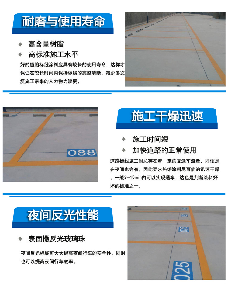 • 熱熔反光涂料是目前應(yīng)用最為廣泛的路用涂料之一,它是一種固體粉末型涂料,在高溫熔融狀態(tài)下使用專用的設(shè)備涂布在路面上。產(chǎn)品具有施工簡易、粘接力強、耐磨性好、抗污性強、色澤亮麗、耐老化性優(yōu)異等優(yōu)點,并且具有良好的抗壓及抗沖擊強度,耐開裂性優(yōu)異,適合于各類路面使用。